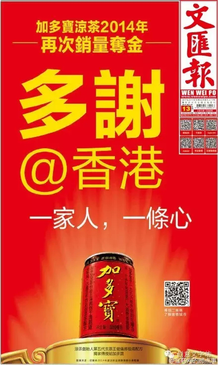 2014年,加多宝败诉,在报纸上推出“两个第一”的调侃广告。